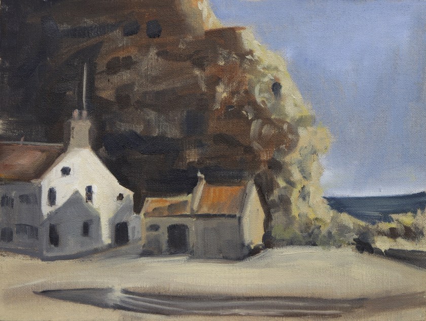 On Saturday morning ,full of confidence and excitement to paint I got up at 5am to catch the morning light, stopping at the first spot that caught my eye by the dumpster outside the Cod and Lobster. This is a view of Cowbar Nab and the lifeboat house. I then dashed off for breakfast to start the day.