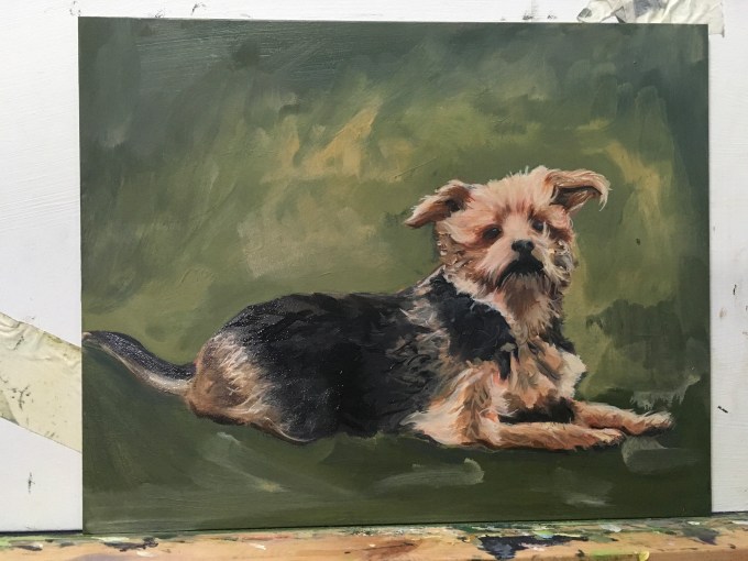 On the way. Making some progress. Just need to remind myself not to paint all the hairs on the dog, and all the blades of grass. It’s very meditative but not good for the overall painting.