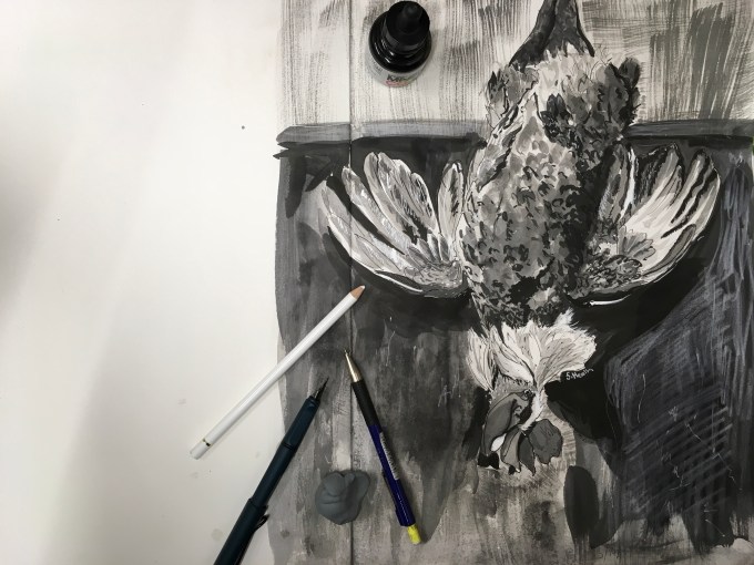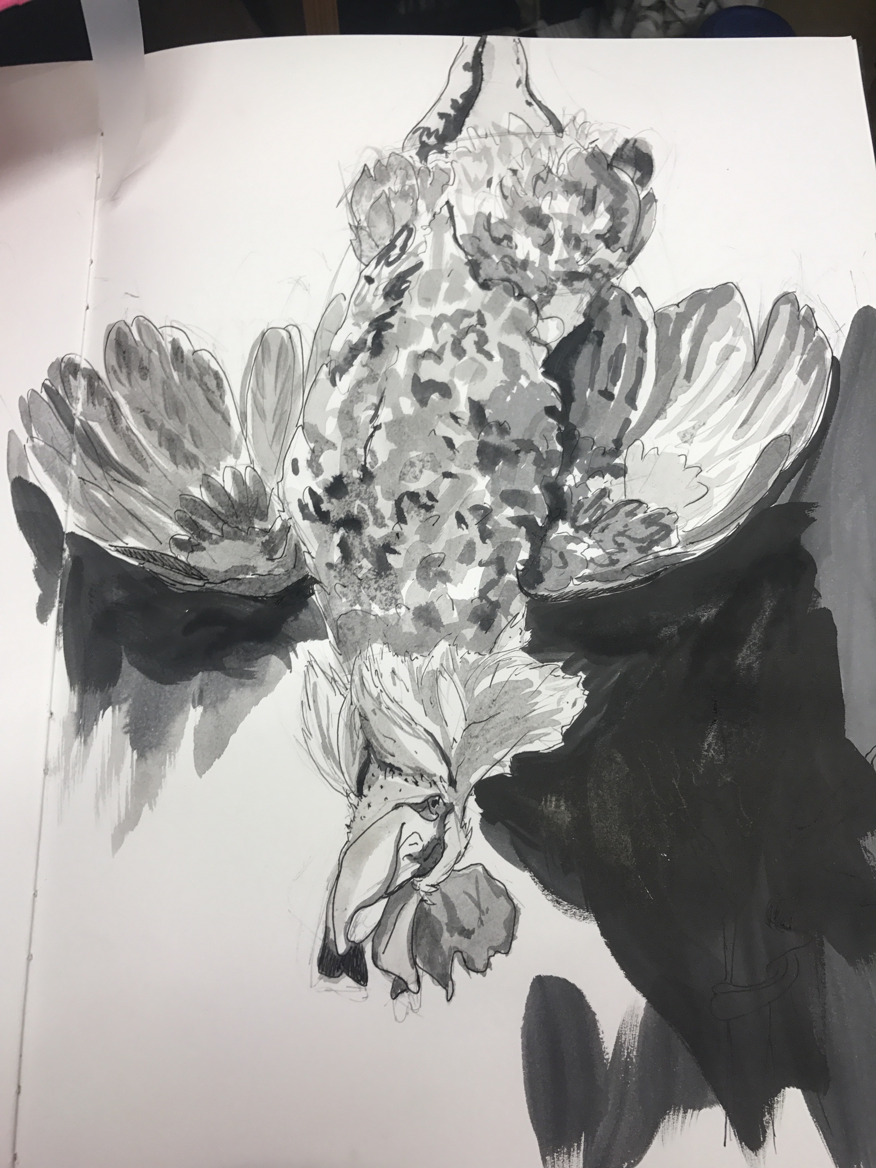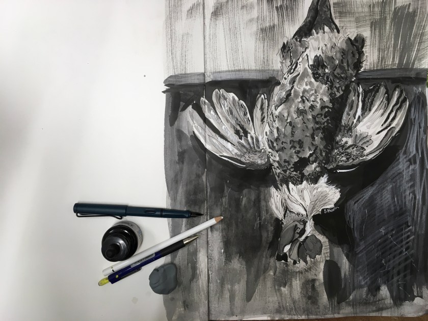 What i drew on day 3… I did have a concept ready to go, but I still can’t settle on one I like. Meanwhile this handsome chap was about to loose his feathers.