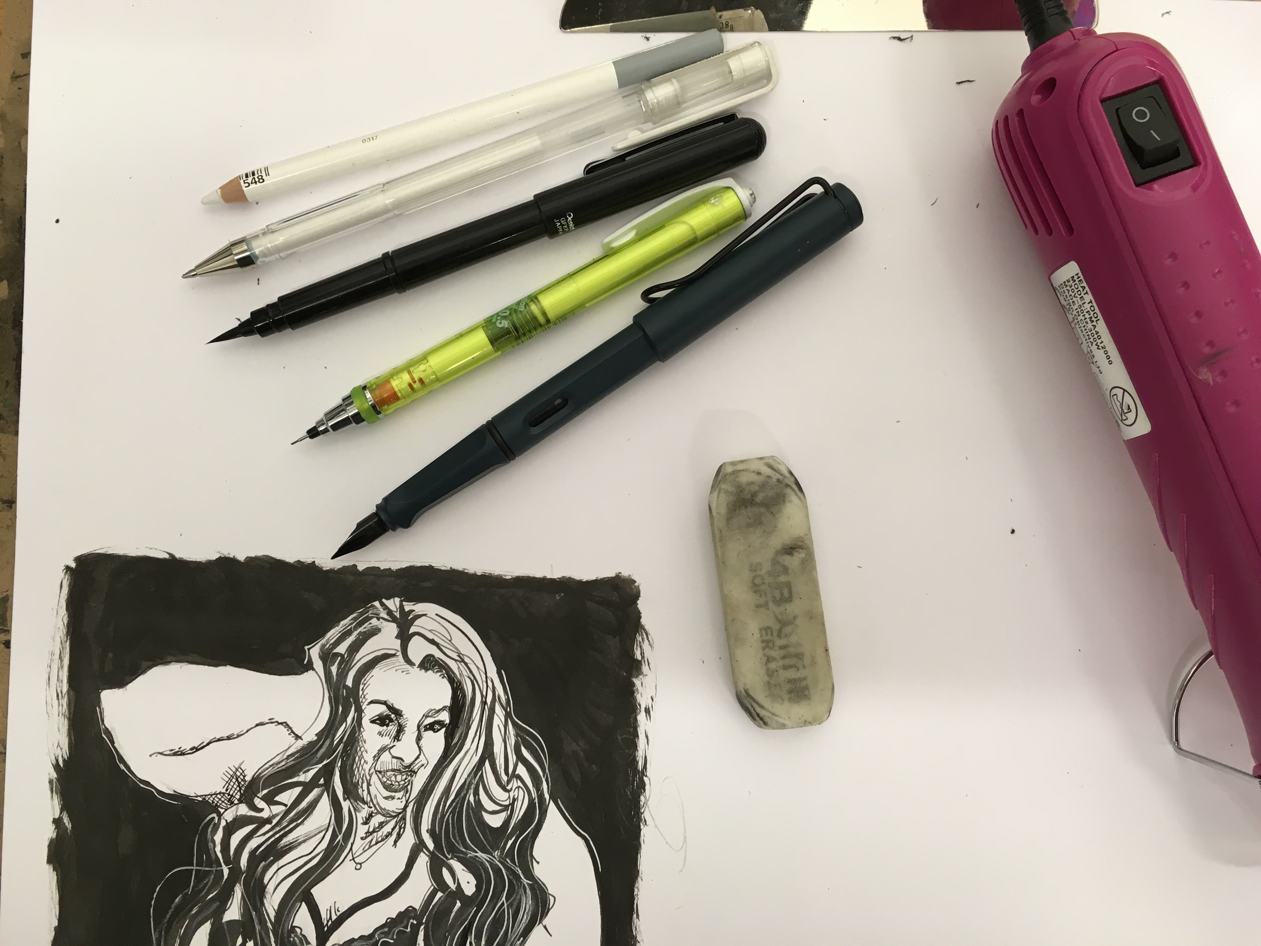 I used reference from Here, staedter charcoal pencil in white, white gel pen, lamy safari fountain pen, Pental pocket fountain pen, kuru toga mechanical pencil and the seemingly unimportant tool that I’ve used the most this month: my heat gun just peeking in the corner there. I’ve never been patient enough to wait for washes to dry, and with inktober I don’t have the time.