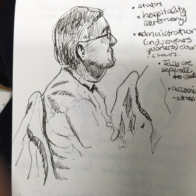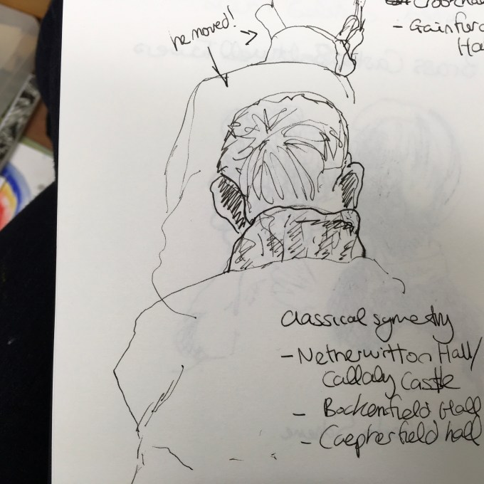 In an effort to improve my people drawing I did some sketching when attending an Art Fund lecture on country houses. I can’t remember the name of the lecturer, but he was very good.