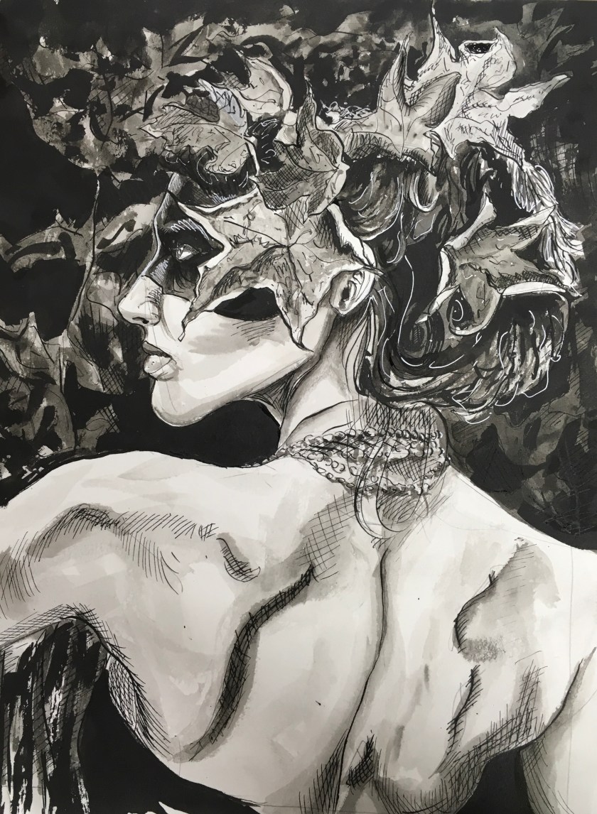 A tenuous link to the theme but I fell in love with this stock image by Chirinstock, that turned up when I searched for ‘found’ because she found the leaves to put in her hair. I went to dark to fast on the background, and I was aiming for more expressive hatching, but overall I am pleased with how it turned out.