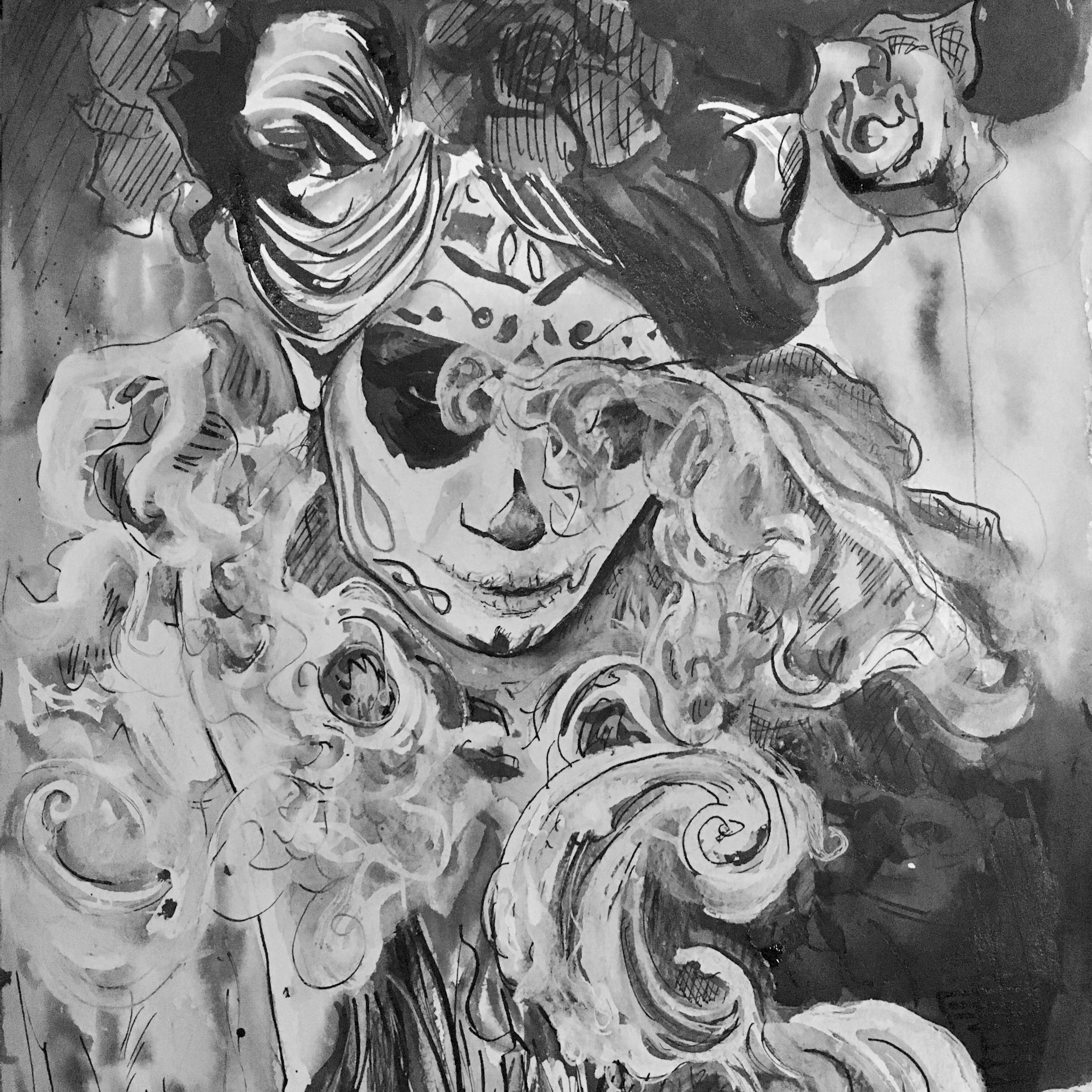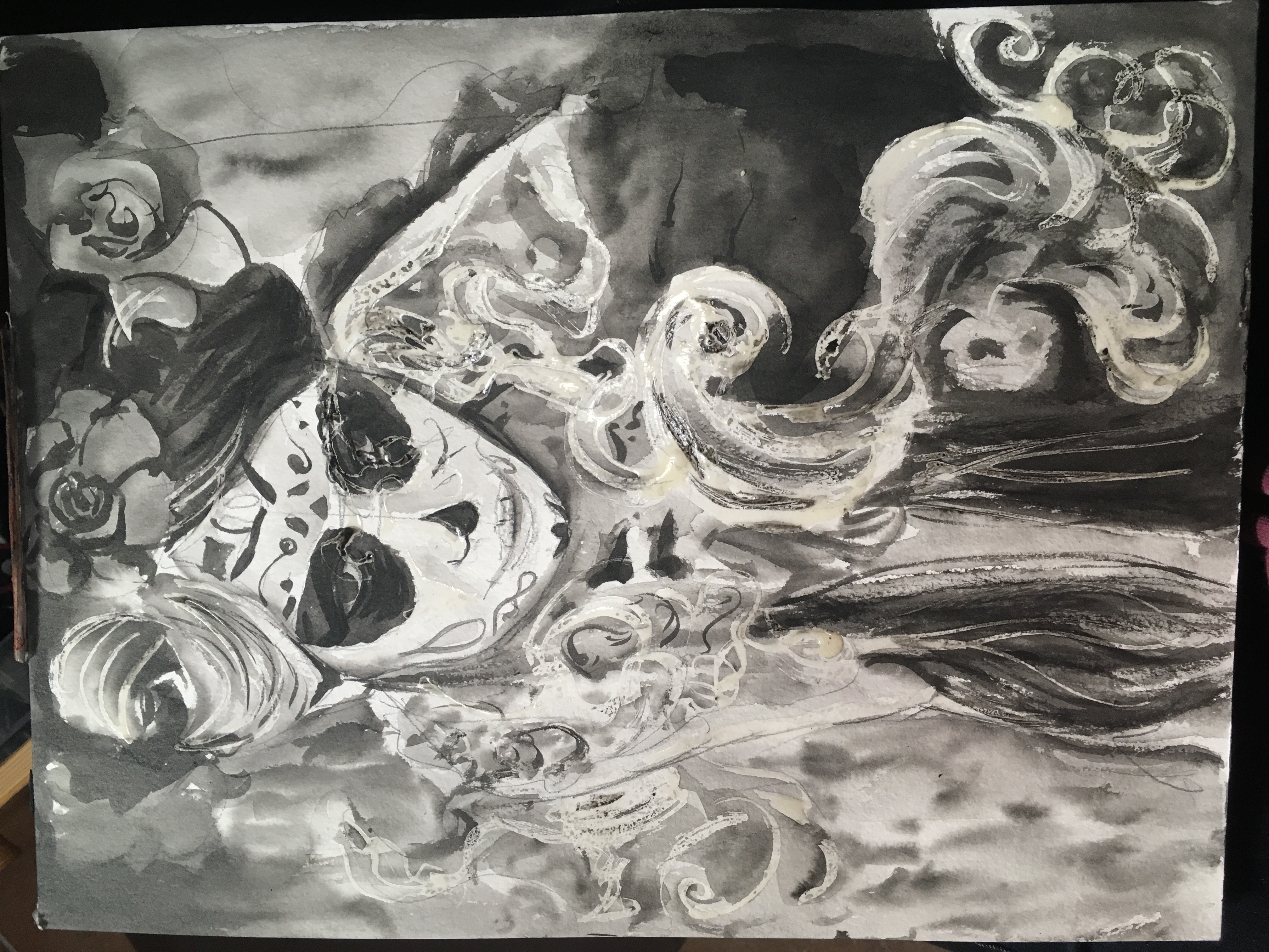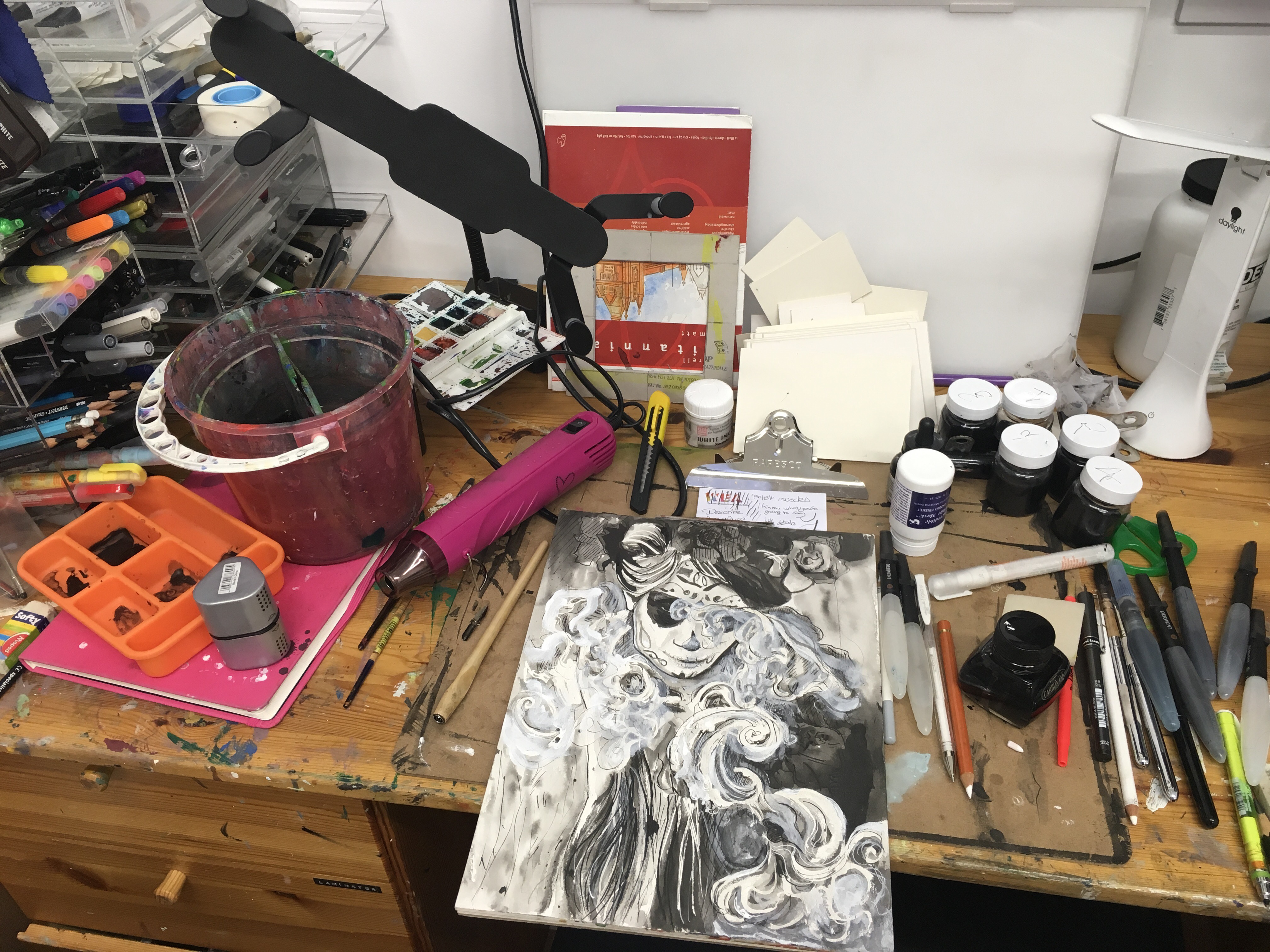 I used Caran D’arche white pencil, polychromos white pencil, acrylic white marker, white gel pen – all the fixing was needed on the smoke! – carbon black ink, and my premise ink washes. I used nib Leonardt 40 the steno nib, now it could be because I was rushing… but I found I was fighting it. It’s a very flexible nib, I’m very heavy handed, so there were lots of ink splots. The kuru toga pencil seems to be out of lead! So I used a Shaw’s ballot pencil, and did I miss having a pre-sharpened point all the time. I can’t go back to using my old mechanical pencil, I’m now ruined for life off this freebie.