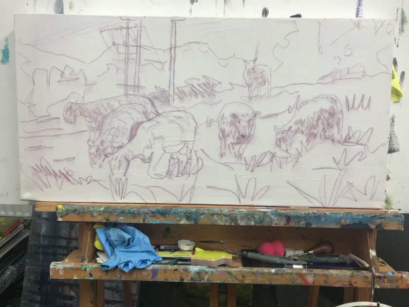I have a load of canvases left over from when I graduated from uni with the impression that painting bigger is better (currently not for me). As I am decluttering, I am using them up. I’ve drawn my lines on, sprayed it with fixative and covered it in matt medium ready for the oil paints. I’ll probably put a coloured ground on, but I’m still debating whether to go with orange (current favourite) or red as the picture is very green. I guess it won’t matter that much…