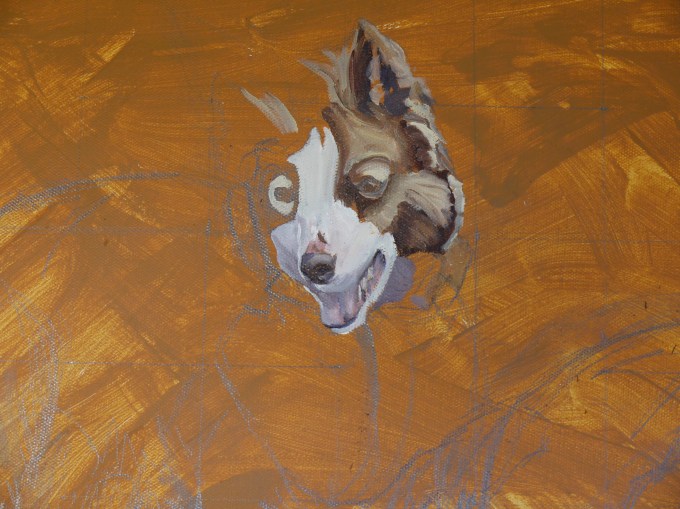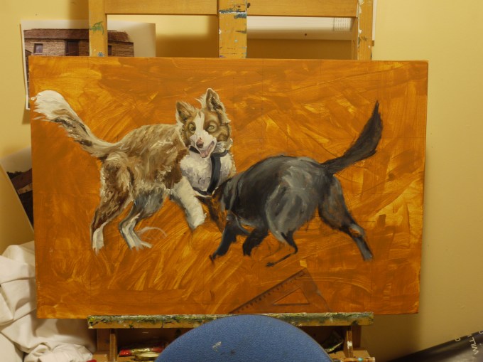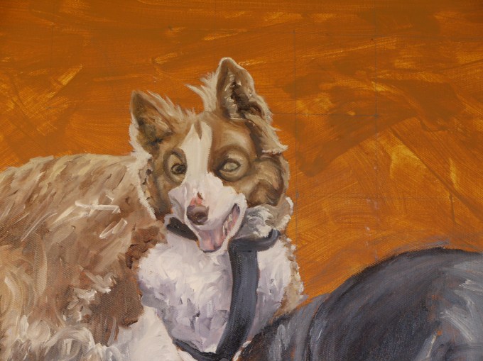 It was painted in the spare room, using the square method to enlarge the photo as accurately as I could. Working from a photo that small I had to use animal anatomy books to figure out what was going wrong with Sam’s leg there. I also used my laptop to zoom in on details like the eyes. Probably about that time I witnessed a customer in the hotel I was working at using one of the first iPads. (So useful for painting from!)