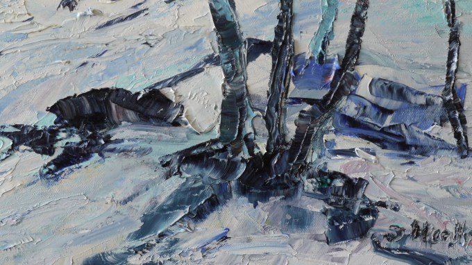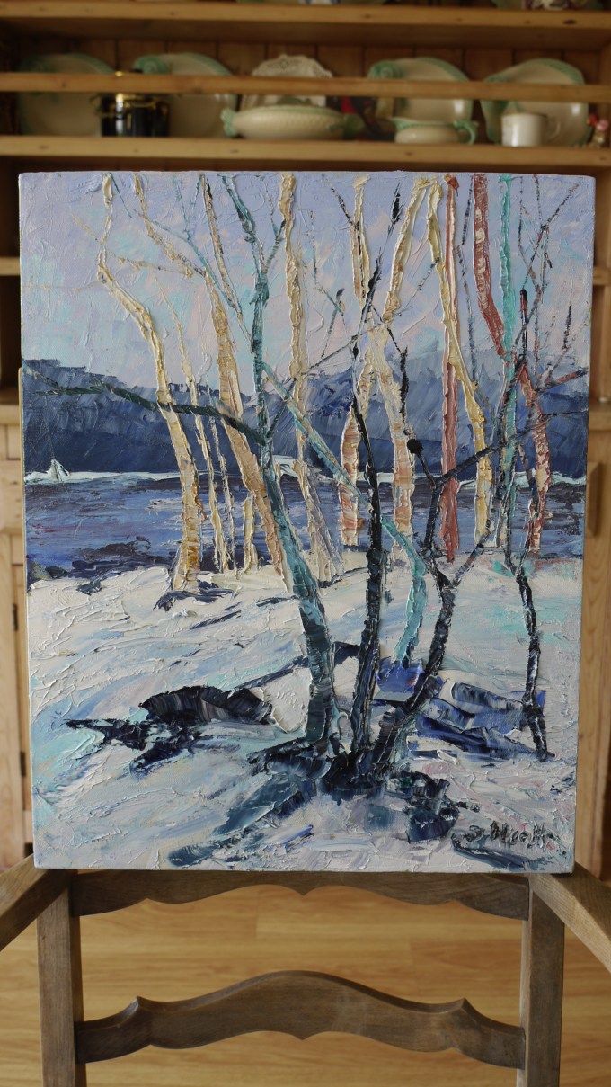 I used palette knives and old credit cards to apply the paint, and hadn’t quite grasped the concept of tonal values, but I had a good source image to work from.