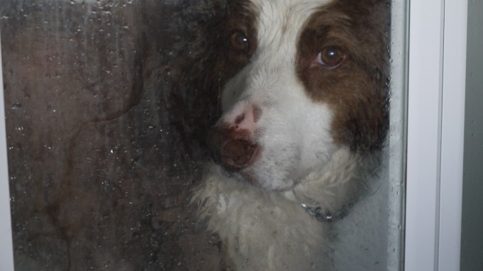 He had bad skin so had to have a medicated bath once a week in his old age, and it had to sit for ten minutes. Here he is appealing to out and for more dog treats.