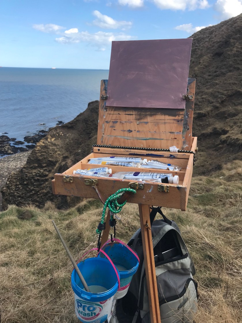 I buddied up with Sue and went painting to the coast. It was a glorious day. Sunshine! Blue skies and seas and such a clear day the horizon line was such a bright blue instead of a haze.