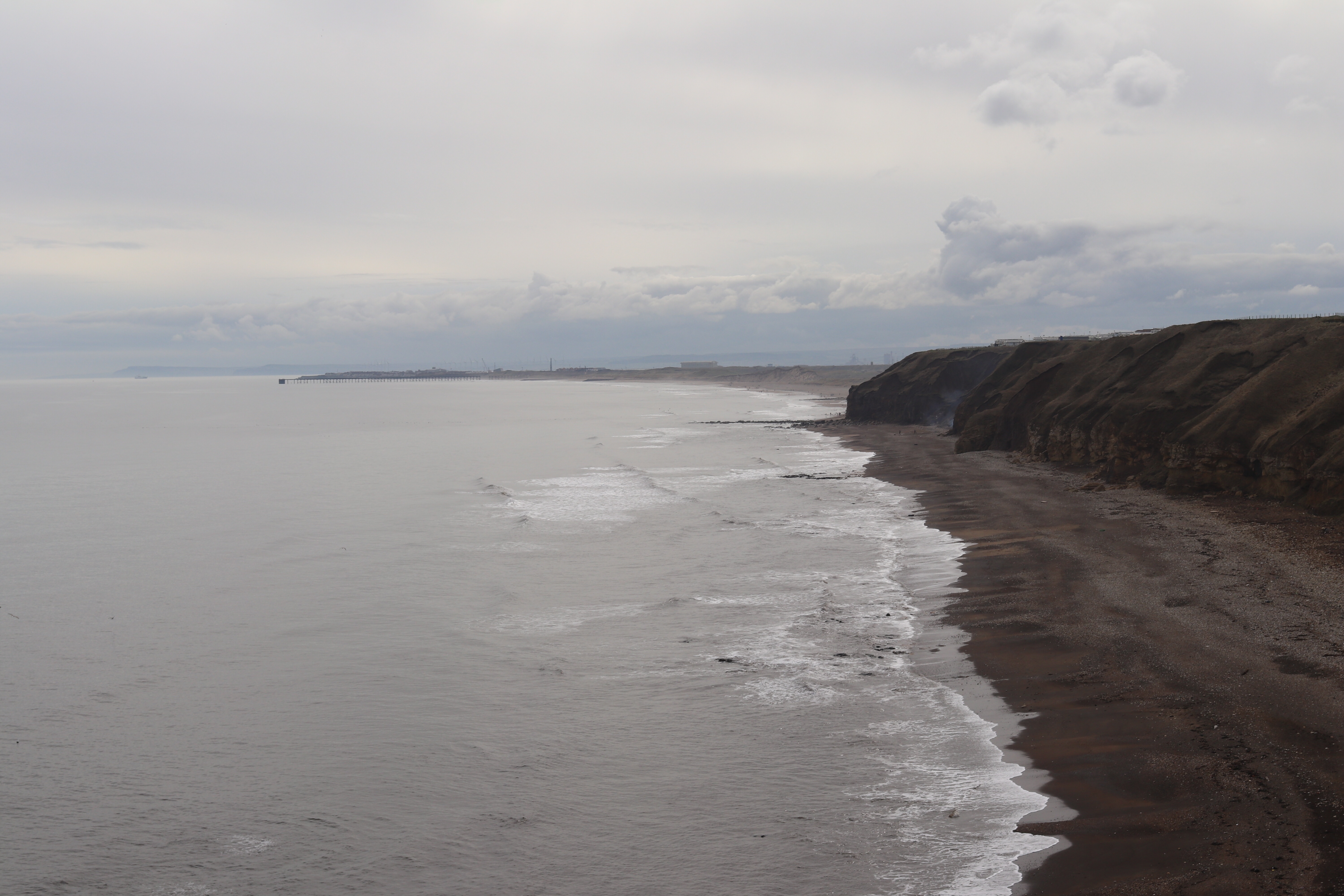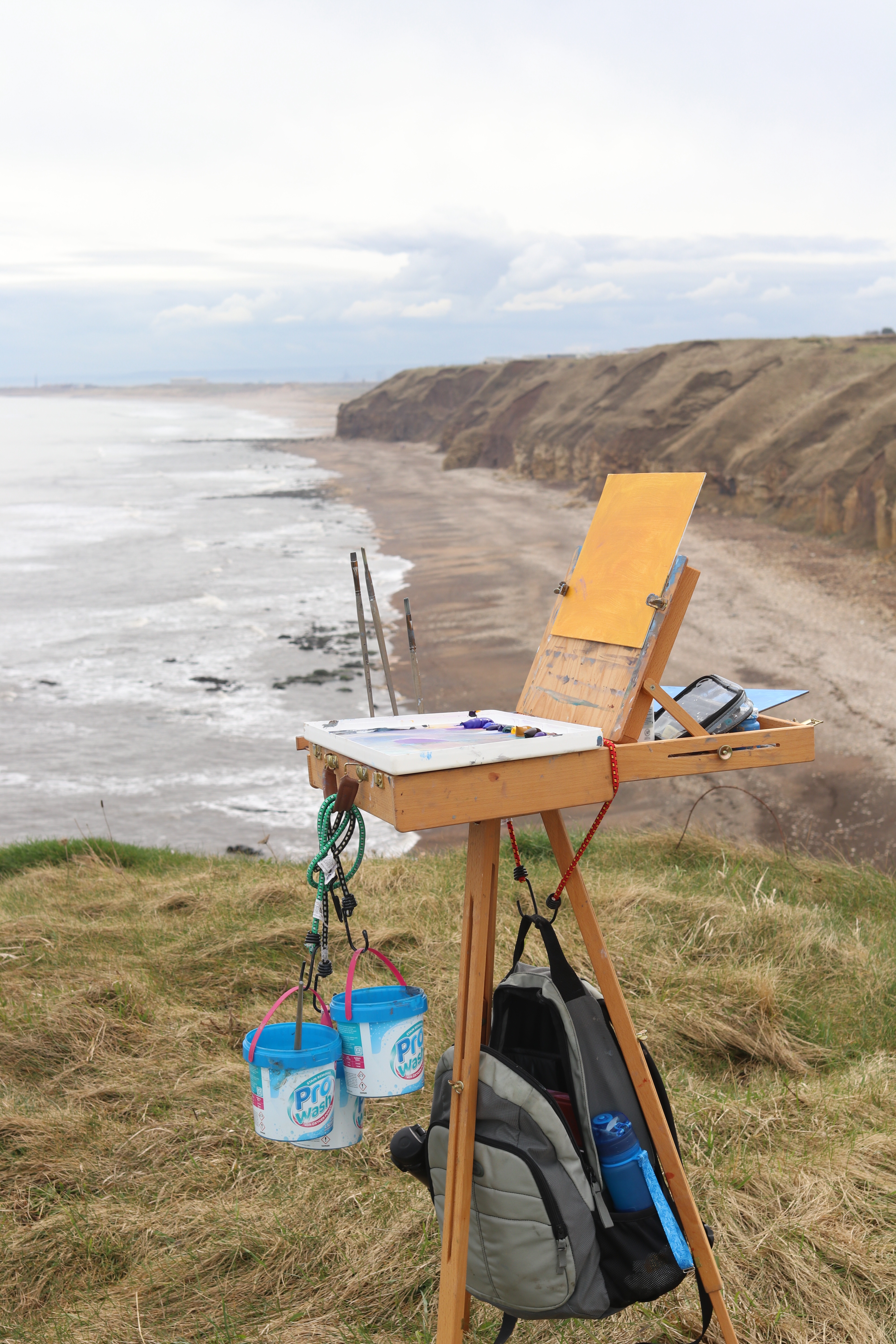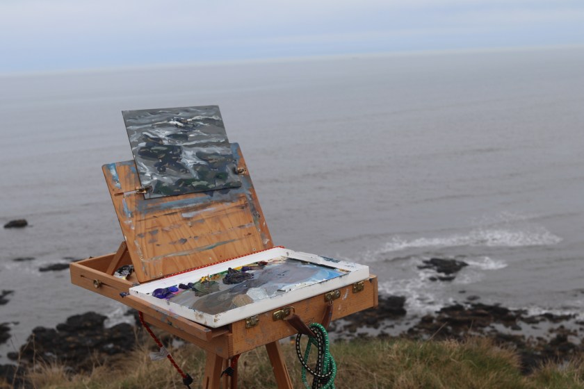 We perched on the cliff tops as we were both tired and couldn’t face the thought of hauling all our stuff up the cliff path. We pitched our easels right by the path, so we got chatting to plenty of passerby’s. Two ladies who had lived in the area since they where kids, said they used to go play on the beach. Due to all the coal mining, just like in Get Carter, because it was filmed around there, they would go home and have to have a bath they were so filthy. An ex coal miner walked passed and said he was glad to be out the mines, but also glad of his pension. Another man was bird watching, and we were serenaded by skylarks, flying up to the sky to impress their potential ladies.