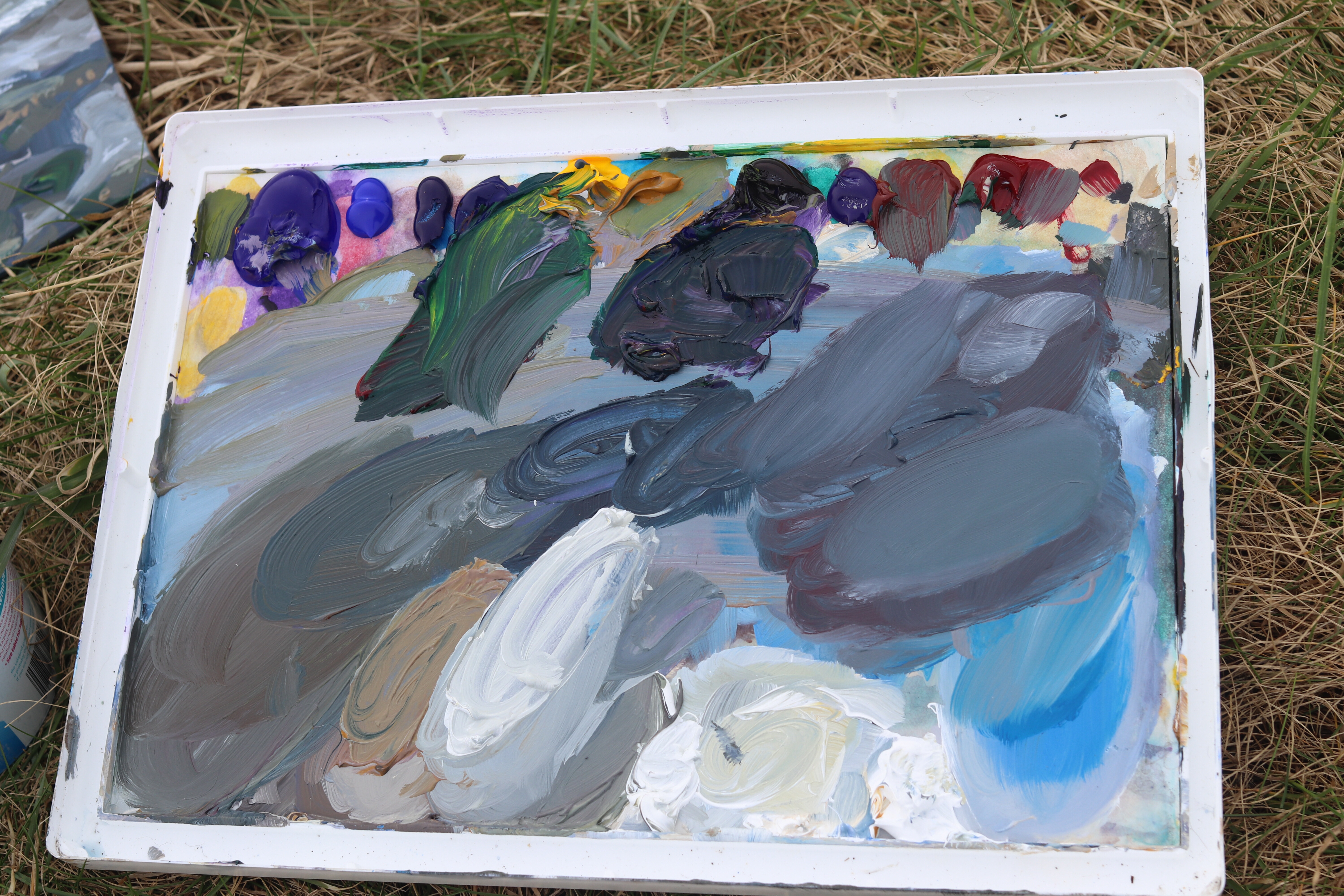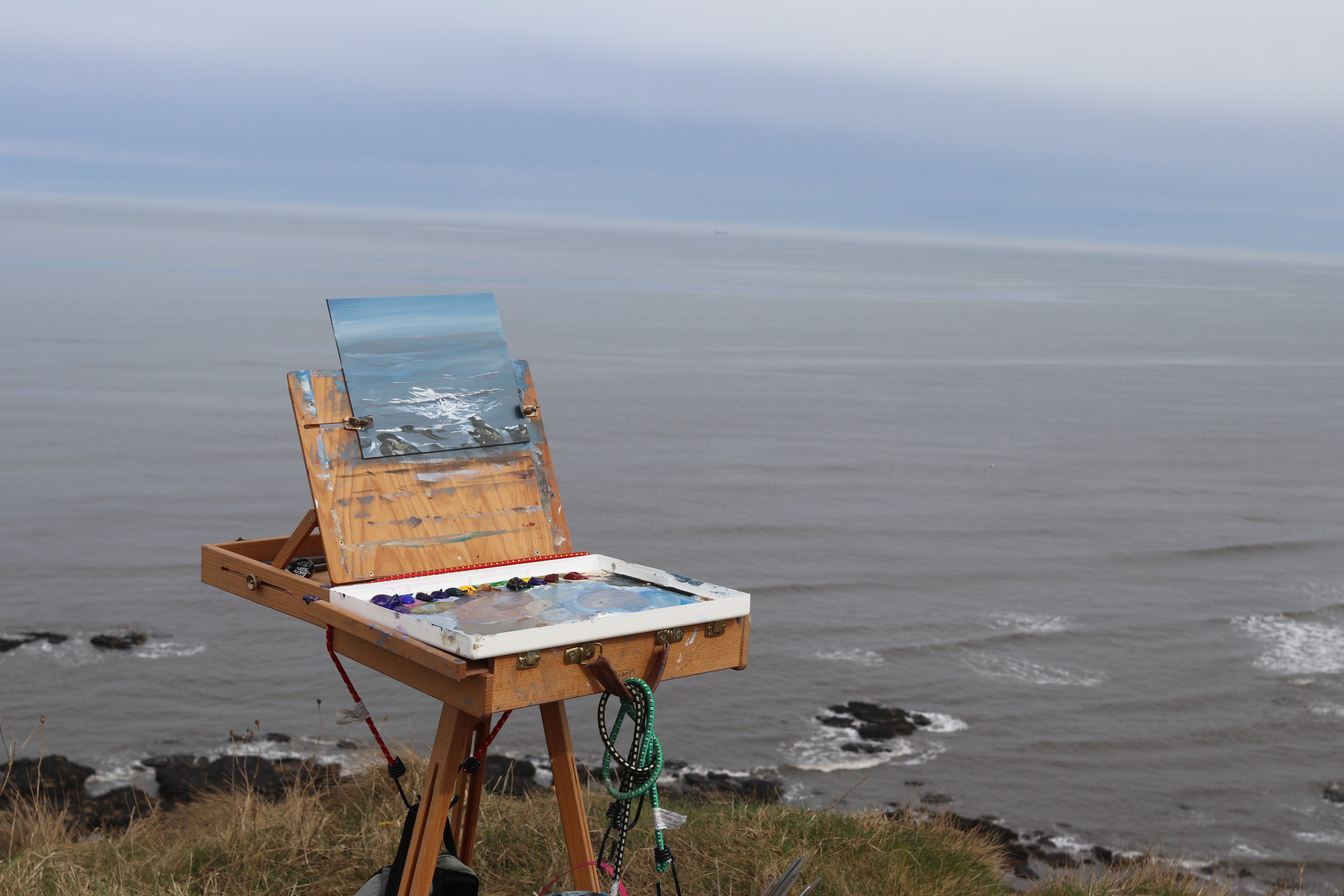 The day started warm, barely breezy and sunny. Just as well, in my rush to try and leave the house before nightfall I’d forgotten my coat and cap, so Sue saved my bacon and lent me two old jumpers. All the haze and cloud we were looking at did start to come our way, and the breeze picked up. When I’m painting I tend to get really cold so I tried doing some squats. Passerby’s warned us that the wind could pick up suddenly. I was very ready to get in the car and go home for a toilet break! We got there at 12 and left at 5. A record for me. I need to go every 2 hours. There’re just far to many people around to have a wilderness break. We’re starting to explore more and hope to find a cafe or something.