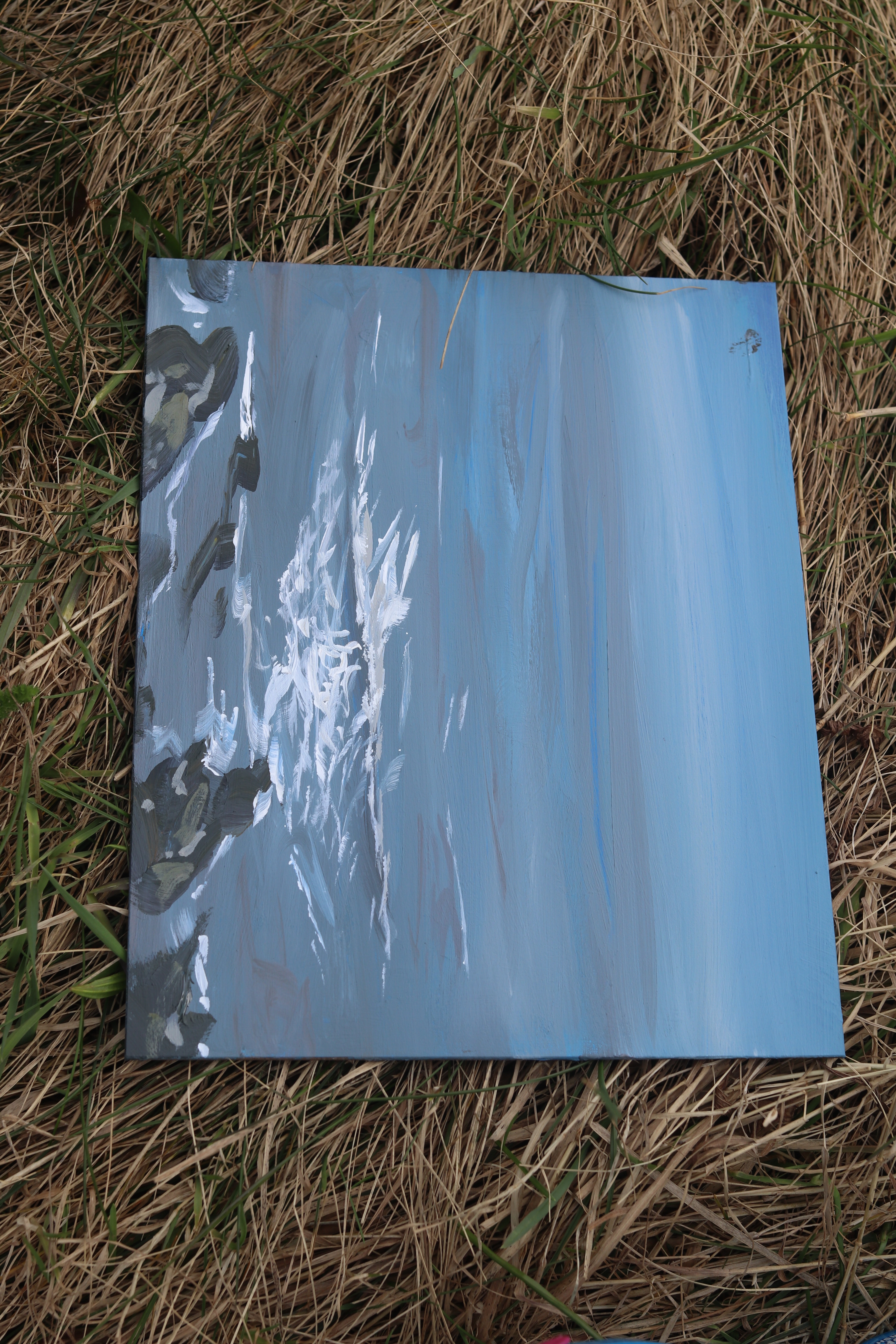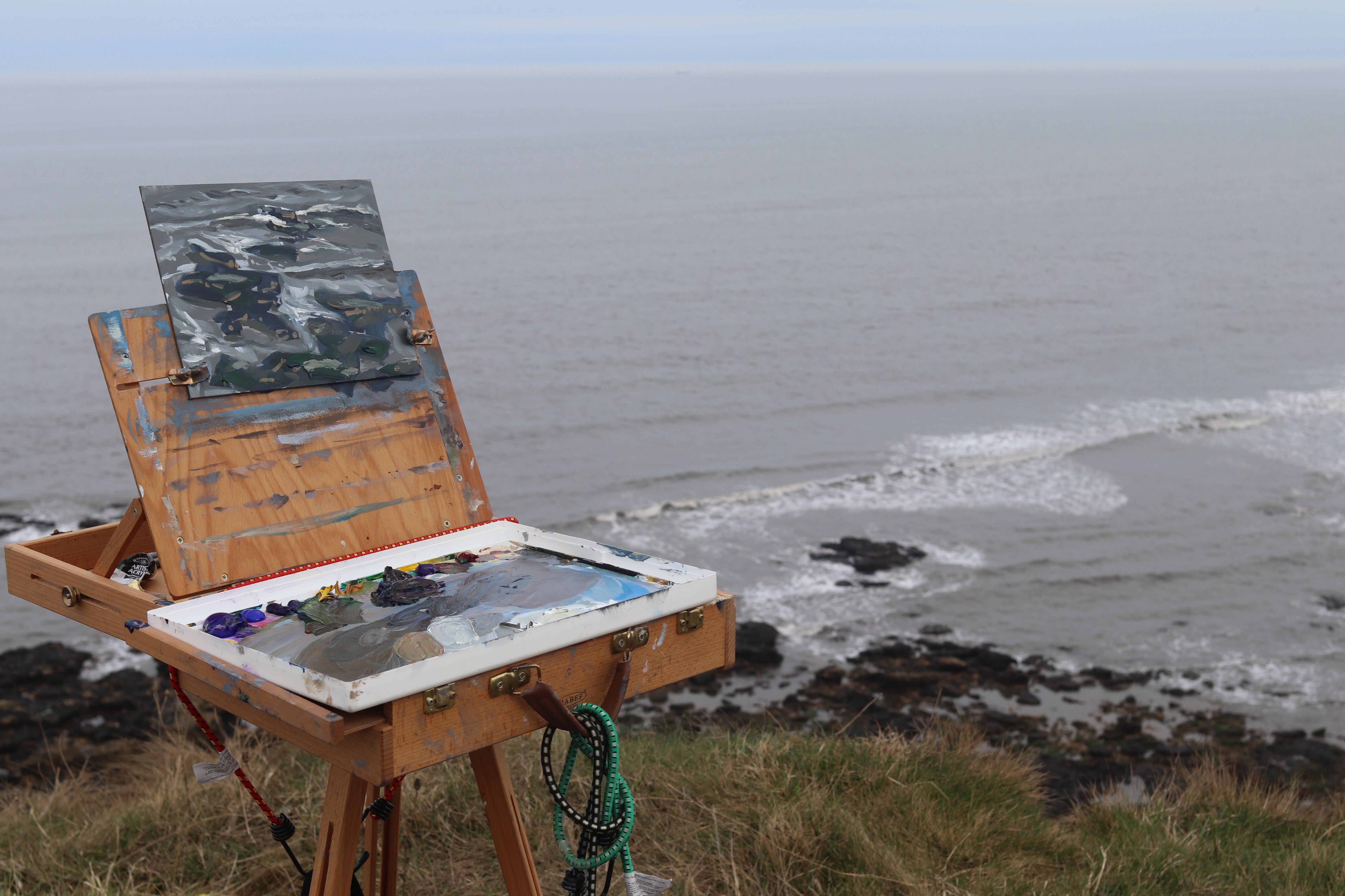 I then tried to paint the breakers coming in, the rocks and the hazy horizon. It was a strange light on the water as the boats in the distance looked like they were sailing in the sky. It was really hard to tell where it all ended and began. I don’t think this was as successful as the rocks felt like they were dropping off the bottom, and the hazy sky/sea left too much similarly coloured space.