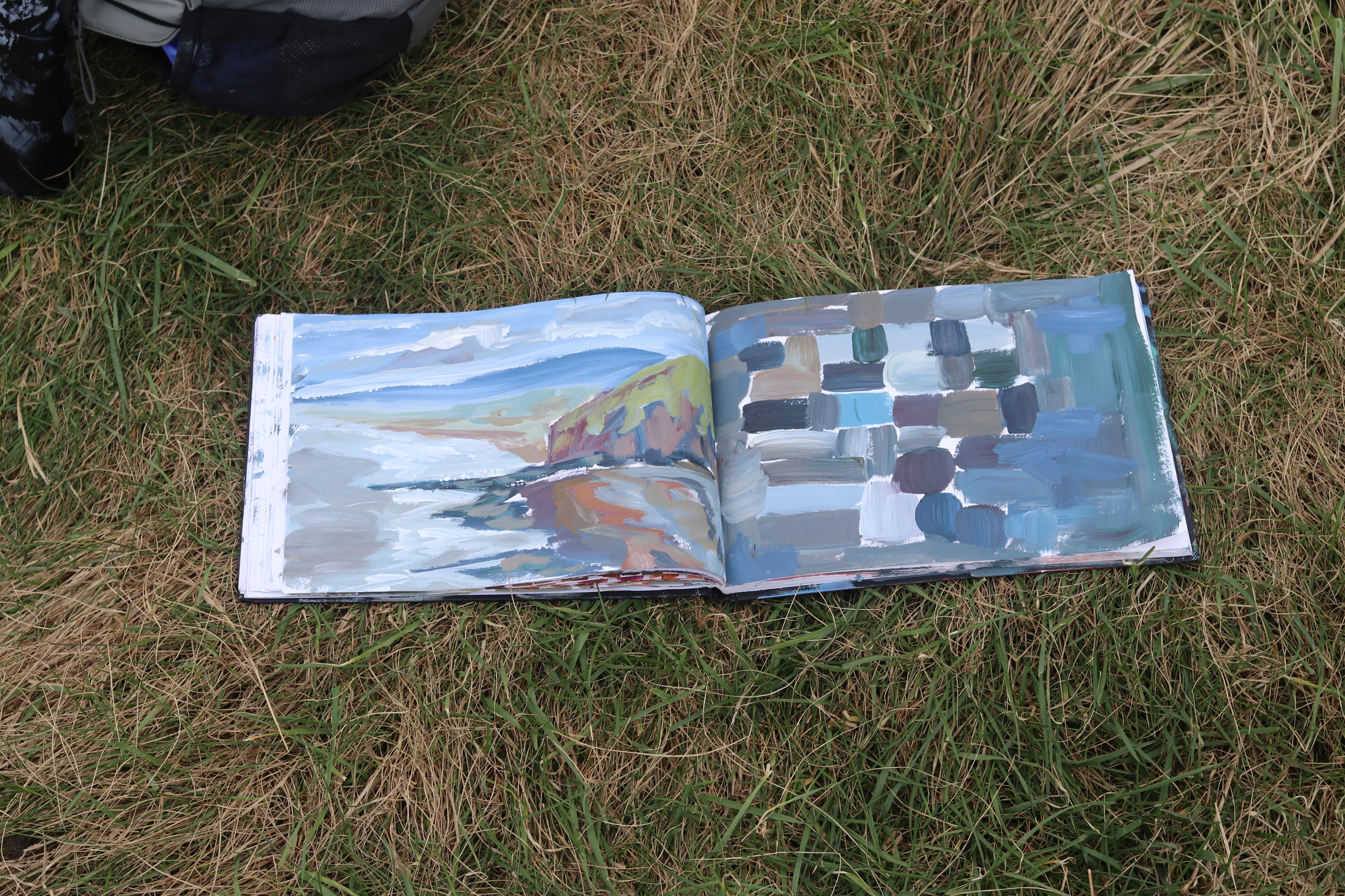 While I was waiting for my paintings to dry, I used up what was on my palette. Trying bolder colours – taking criticism! And taking a sample of my palette. From this I definitely want to add more detail to the beach, but not that bright. I had plenty of time to ponder this as I then waited for my sketch book to dry…