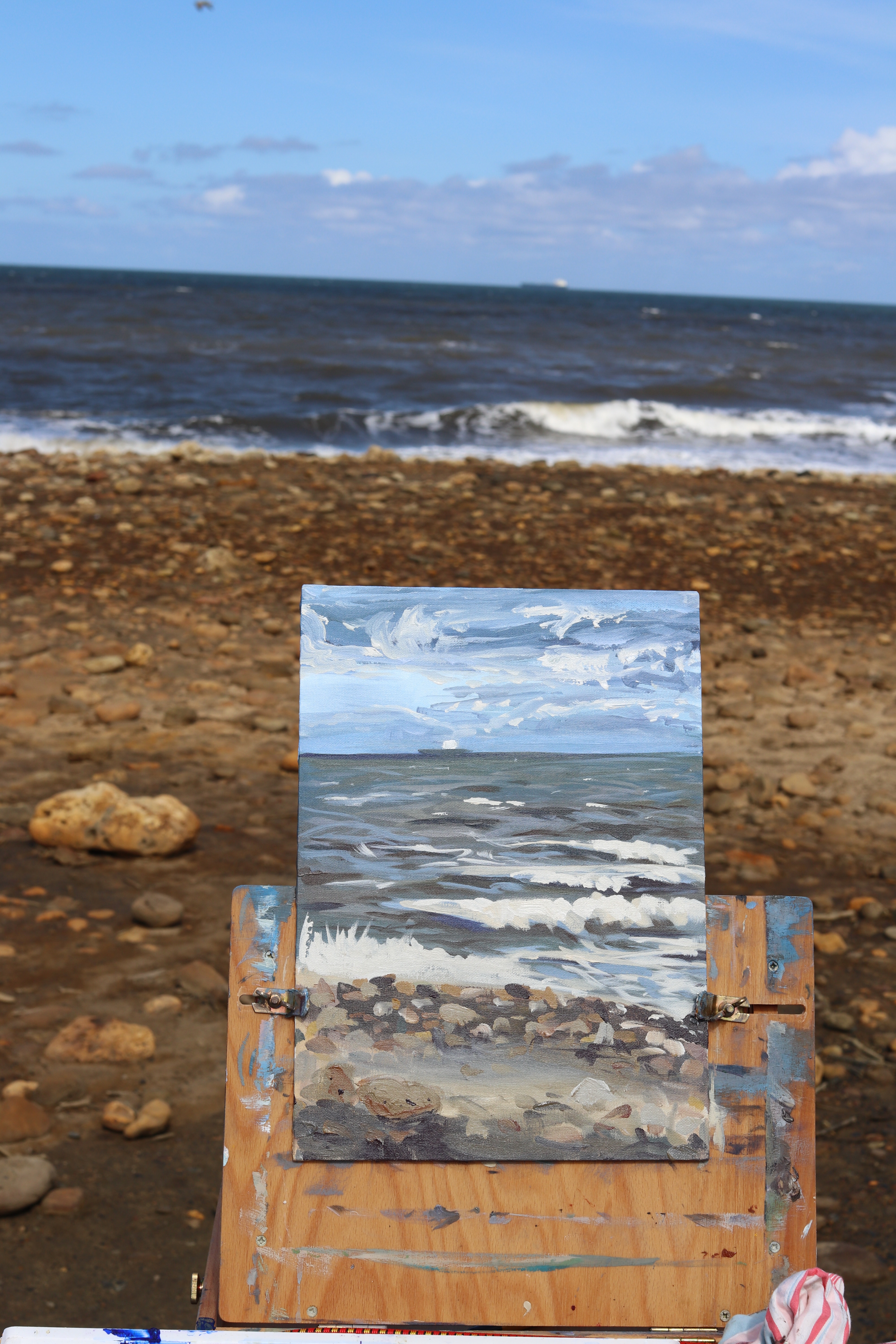 We went to the same spot again, but it was so windy we had to go down to the beach. We found a sheltered spot and decided what we wanted to paint from that area. There weren’t as many people around, but we still spent a good amount of chatting to people. We learned that surf can be created by the wind, like it was on that day or by low pressure further out to sea or up the country. We even had the mystery of why the tides are higher solved: spring tide. They have about a metre more water.