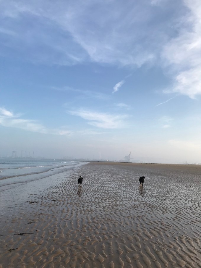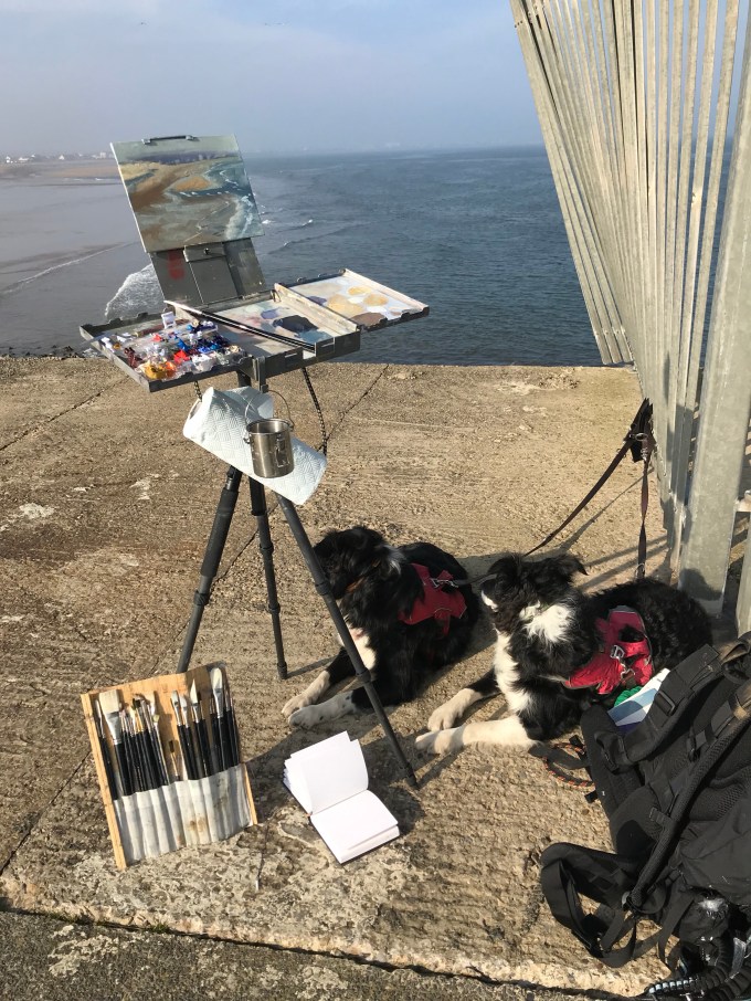 Last Sunday I had made very sensible, serious adult plans that involved going to the ‘toon to go to the bank, and while I was there seeing an art exhibition. This coincided with the fake spring we had. The weather was so good, I had to go painting. As I had the dogs, I went to North Gare beach as one of my favourite dog walks.