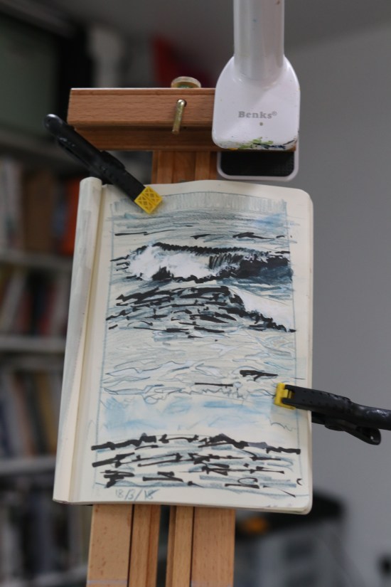 There were some things I was really struggling to capture when I was painting outside. The sea keeps moving! So from the numerous photos I’d taken, I painted a study of the ways, white horses and wet sand, the points of interest. I started off with a purple underpainting as I accidentally got purple on […]